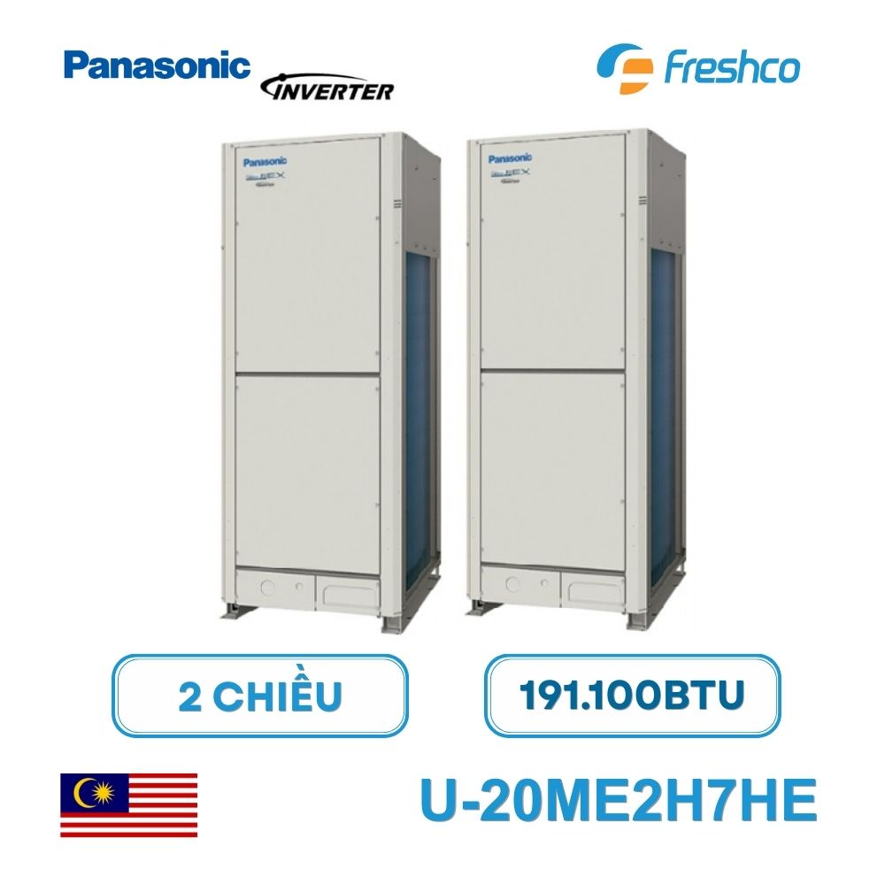 Panasonic U-20ME2H7HE là dàn nóng điều hòa trung tâm thuộc hệ VRF FSV-EX ME2, dòng 2 chiều Inverter tiêu chuẩn, được thiết kế cho các công trình cần công suất lớn, vận hành ổn định và linh hoạt trong bố trí hệ thống. Theo thông số sản phẩm, model này có công suất làm lạnh 191,100BTU/h tương đương 56.0kW, công suất sưởi ấm 215,000BTU/h tương đương 63.0kW, sử dụng nguồn điện 3 pha 380/400/415V và môi chất lạnh R410A.