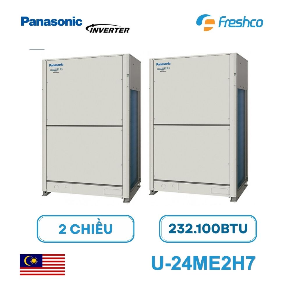 Panasonic U-24ME2H7 là dàn nóng 2 chiều thuộc hệ điều hòa trung tâm VRF FSV-EX ME2, dòng hiệu suất cao, sử dụng môi chất lạnh R410A và nguồn điện 3 pha 380/400/415V. Theo bảng thông số, model này có công suất làm mát 68.0kW (232,100BTU/h) và công suất sưởi 76.5kW (261,100BTU/h), là tổ hợp của hai dàn U-12ME2H7 U-12ME2H7.