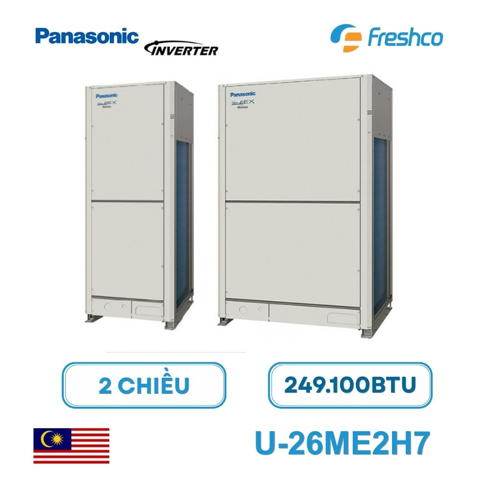 Panasonic U-26ME2H7 là dàn nóng điều hòa trung tâm thuộc hệ VRF FSV-EX, dòng ME2 2 chiều Inverter hiệu suất cao, sử dụng môi chất lạnh R410A và nguồn điện 3 pha 380/400/415V. Theo thông số được các nhà phân phối công bố, model này có công suất 26.0HP (khoảng 249.100BTU), là tổ hợp của hai dàn nóng U-10ME2H7 và U-16ME2H7, phù hợp với các công trình như tòa nhà văn phòng, khách sạn, trung tâm thương mại, bệnh viện, trường học, nhà ga… cần hệ thống điều hòa trung tâm công suất lớn, ổn định và tiết kiệm điện.