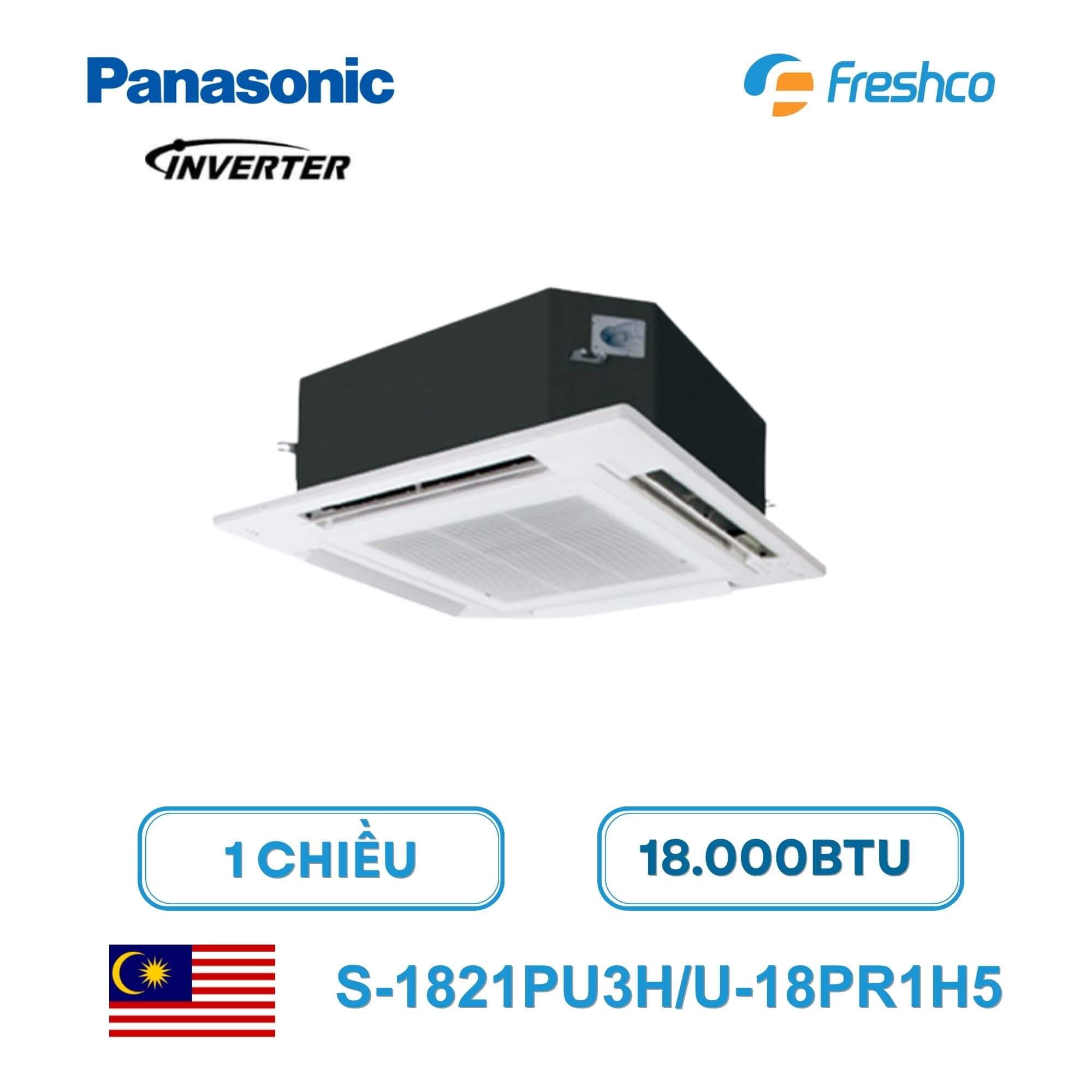 Điều hòa âm trần Panasonic S-1821PU3H/U-18PR1H5 công suất 18.000BTU là dòng máy lạnh cassette inverter 1 chiều sử dụng môi chất lạnh R32 hiện đại. Sản phẩm thuộc thương hiệu Panasonic nổi tiếng của Nhật Bản và được sản xuất, nhập khẩu chính hãng từ Malaysia.