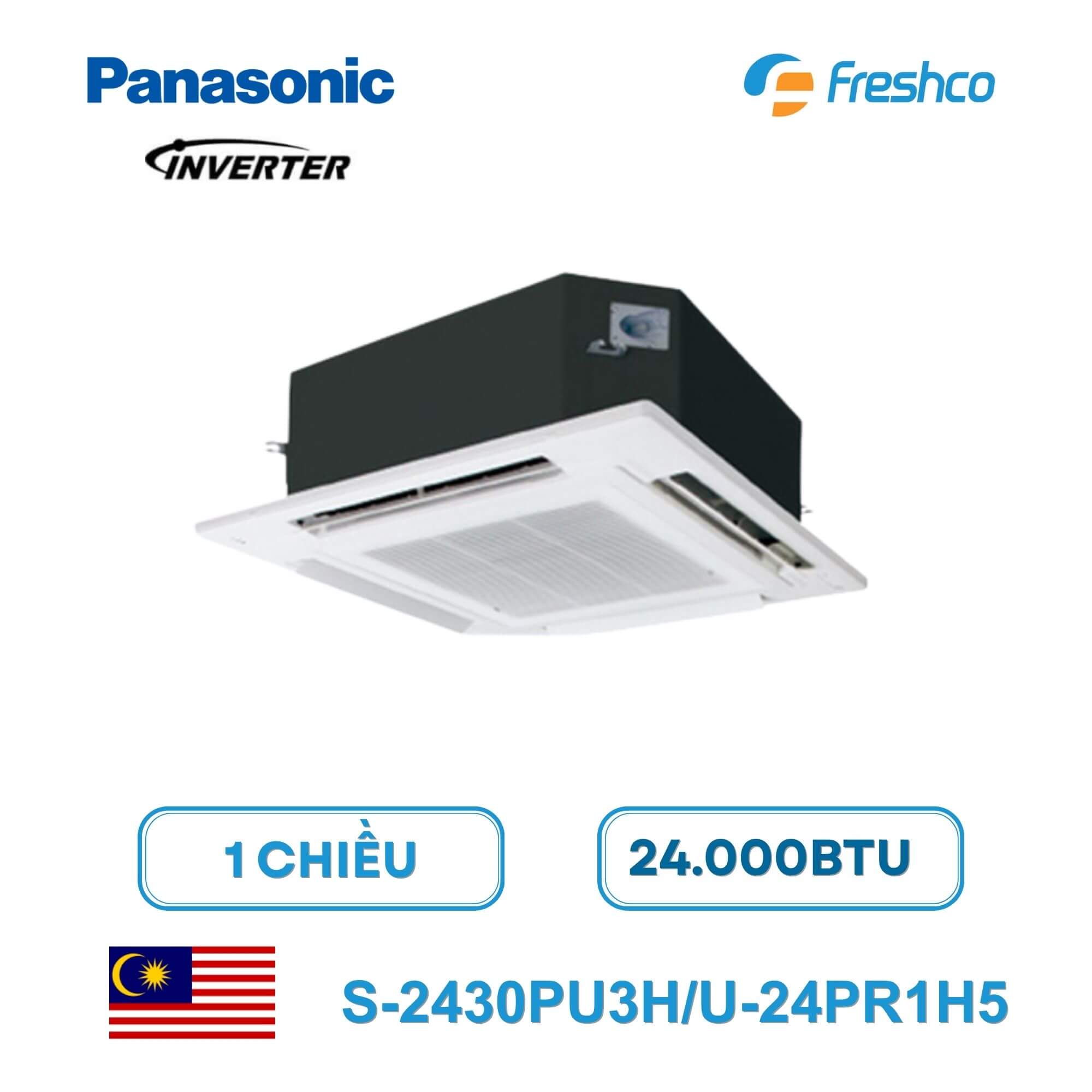 Điều hòa âm trần Panasonic S-2430PU3H/U-24PR1H5 công suất 24.000BTU là dòng điều hòa cassette 1 chiều inverter sử dụng môi chất lạnh R32 hiện đại. Sản phẩm thuộc thương hiệu Panasonic nổi tiếng của Nhật Bản và được sản xuất, nhập khẩu chính hãng từ Malaysia.